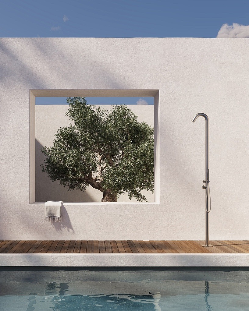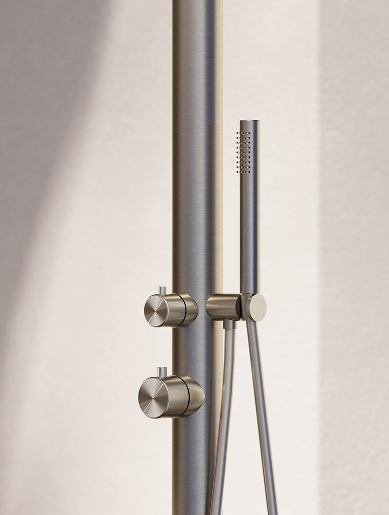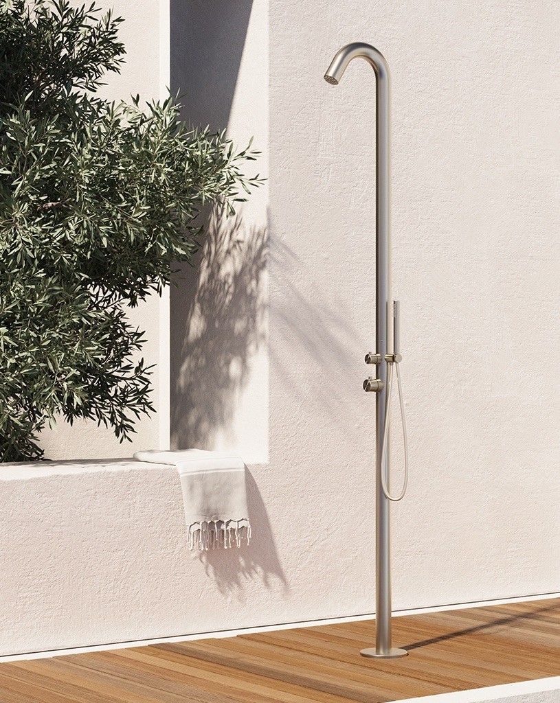 La colonna doccia esterna Lympha di Colacril unisce design essenziale e materiali di alta qualità, ideale per ambienti outdoor moderni e raffinati. Perfetta per giardini, piscine e aree wellness, garantisce praticità, resistenza e comfort in ogni utilizzo.