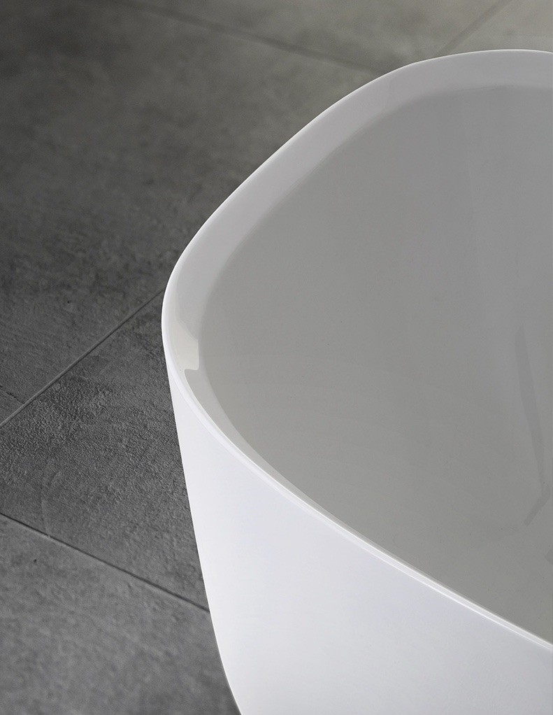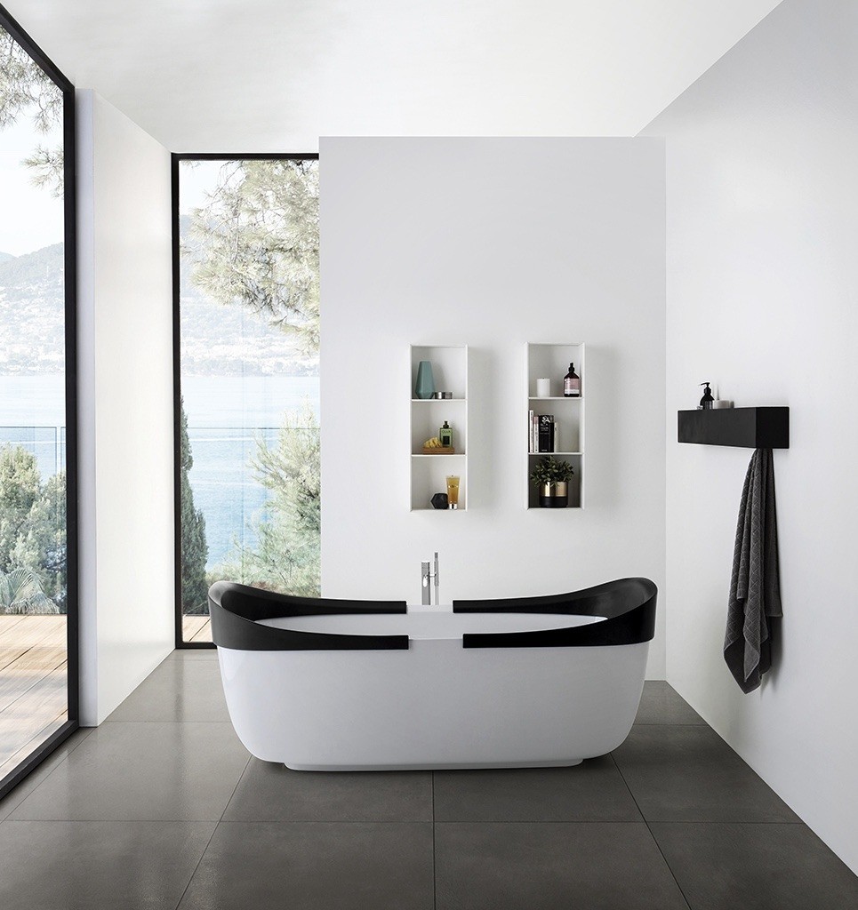 Vasca ovale free standing in acrilico che può essere arricchita da diversi accessori: struttura metallica porta oggetti colorata e un comodo cuscino in grado di isolarti all’interno della vasca per un’esperienza di relax totale.